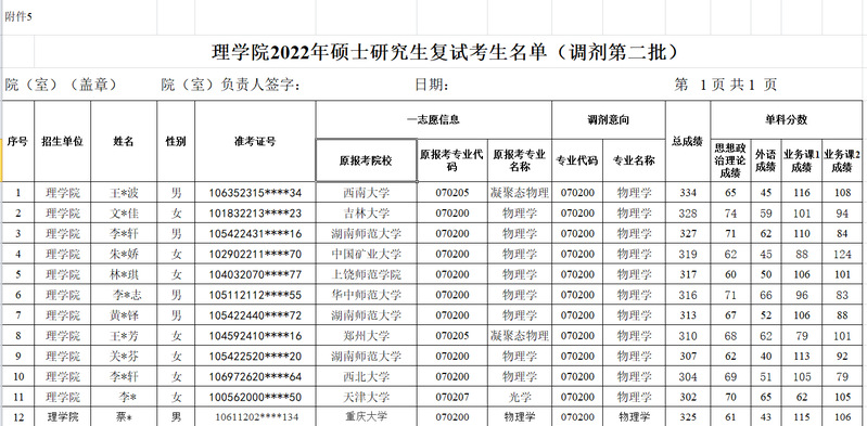 理学院2022年硕士研究生物理调剂第二批复试考生名单公示