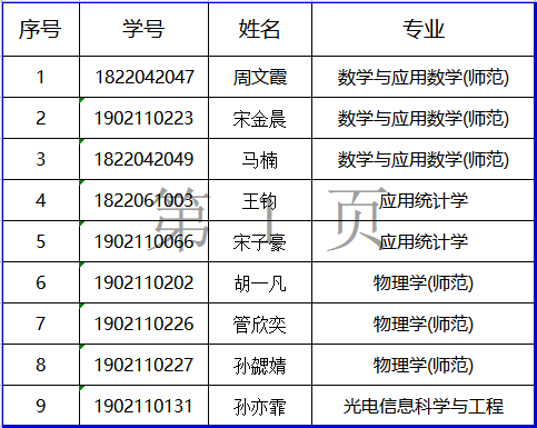 根据教育部《2023年全国硕士研究生招生工作管理规定》、成人影院 《关于做好推荐2023年优秀应届本科毕业生免试攻读硕士学位研究生工作的通知》和《理学院2023年推荐优秀应届本科毕业生免试攻读硕士学位研究生工作实施细则》等相关文件要求精神,经学生自主申报,学院审核,现将拟推荐2023年免试攻读硕士学位研究生名单公示如下: