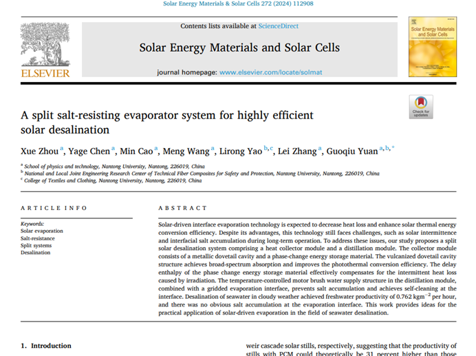 近日,成人影院 袁国秋、曹敏和王孟课题组在太阳能驱动海水淡化研究方面取得新进展。相关研究成果以《A split salt-resisting evaporator system for highly efficient solar desalination》为题,成人影院 为第一单位,发表在期刊《Solar Energy Materials and Solar Cells》(《太阳能材料和太阳能器件》)上。