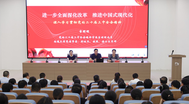 9月1日下午,成人影院 、数学与统计学院联合举办学习贯彻党的二十届三中全会精神南通市委宣讲团报告会。南通市委宣讲团成员、校党委常委、副校长吉明明作宣讲报告。