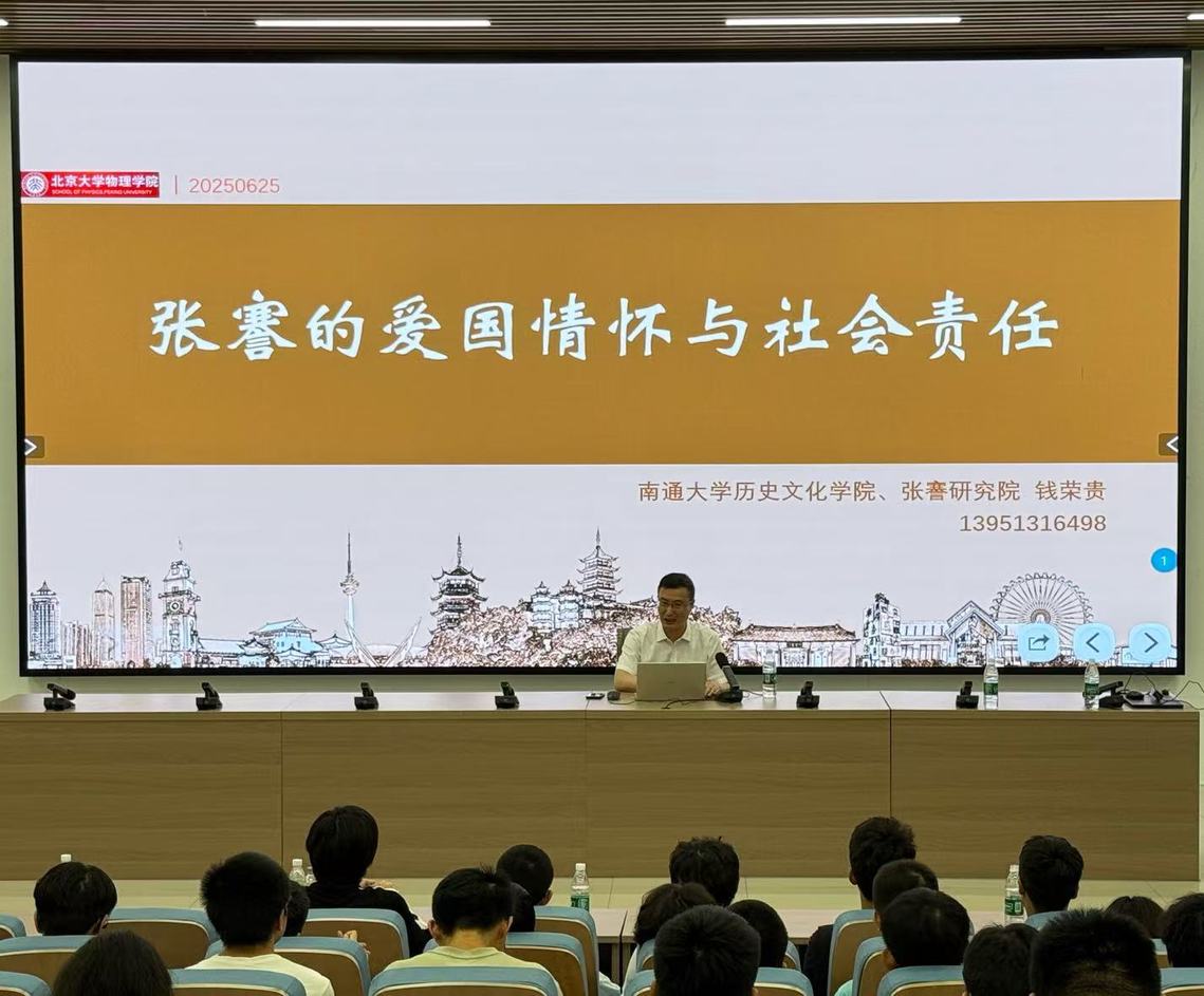 6月25日,39号楼A112教室座无虚席,成人影院 历史文化学院、张謇研究院院长钱荣贵教授应邀来院作题为“张謇的爱国情怀与社会责任”主题讲座。北京大学物理专业学生与成人影院 的学子们齐聚一堂,怀着对先贤的崇敬之情,聆听张謇精神解读。院长仲崇贵、副院长傅怀梁以及师生代表参会。