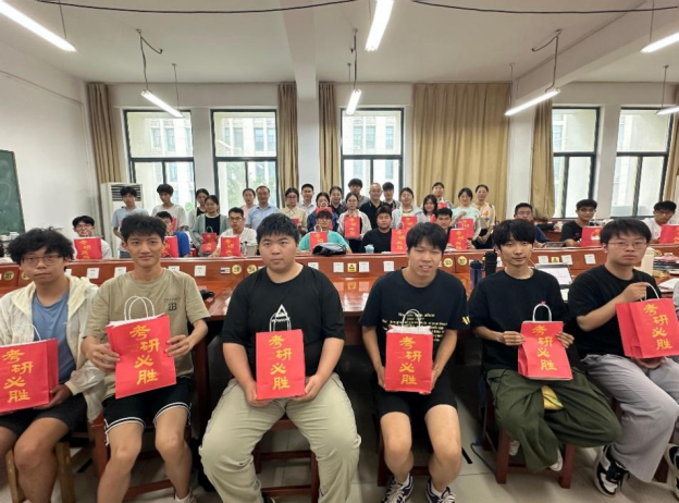 考研教室里,徐凌与同学们亲切交流,充分肯定了大家在炎炎夏日努力拼搏的精神,详细询问了同学们的学习安排、备考进度和生活需求等,并就自习室环境、学习资源保障等问题听取了学生的反馈与建议;仲崇贵叮嘱同学们在复习考学的同时,也要合理安排作息时间,保证充足的睡眠和适当的锻炼,他勉励同学们要坚定信心、保持节奏,把握暑期关键阶段,科学规划、高效复习,争取在考试中一战成“硕”。学院还特意为留校备考的学子们准备了夏日慰问礼包,内含清凉饮品、防暑用品、学习用品等实用物件,为“研途”保驾护航。现场气氛温馨热烈,同学们纷纷表示,学院的关怀让他们倍感温暖和鼓舞,将不负众望,以更加坚定的信念投入到考研复习中,用实际行动回报学院的厚爱与期望。