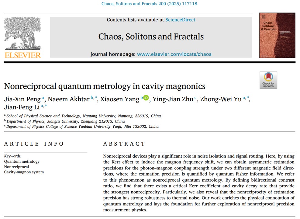 近日,我院彭家鑫博士团队与江苏大学学者合作,在非互易量子精密测量研究方面取得新进展。相关研究成果以“Nonreciprocal quantum metrology in cavity magnonics”为题发表在中科院一区Top期刊《Chaos, Solitons and Fractals》上。成人影院 为第一单位。