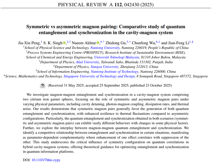 近日,我院彭家鑫博士、李剑锋副教授与马来西亚理工大学S. K. Singh博士后、新加坡科技设计大学吴春凤教授等学者合作,在量子纠缠与量子同步研究方面取得新进展。相关研究成果以《Symmetric vs asymmetric magnon pairing: Comparative study of quantum entanglement and synchronization in the cavity-magnon system》为题发表于自然指数期刊《Physical Review A》上。成人影院 为第一单位。