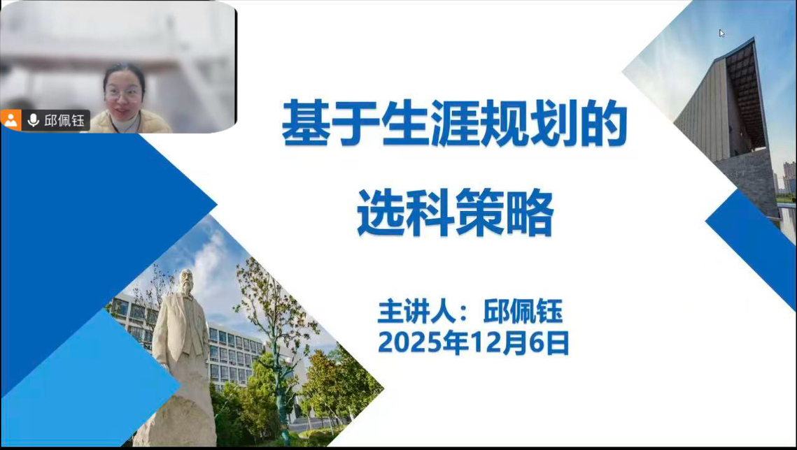 12月6日,学校心理健康教育研究与服务中心副主任邱佩钰应物科院邀请,通过线上平台为南京市六合区实验高级中学高一年级学生及家长带来了一场题为《基于生涯规划的选科策略》专题讲座。本次活动是成人影院 “祈通讲习团”系列活动的重要组成部分,旨在从生涯发展视角帮助高中生及家长科学规划选科路径,助力学生实现学业与生涯的良性衔接。