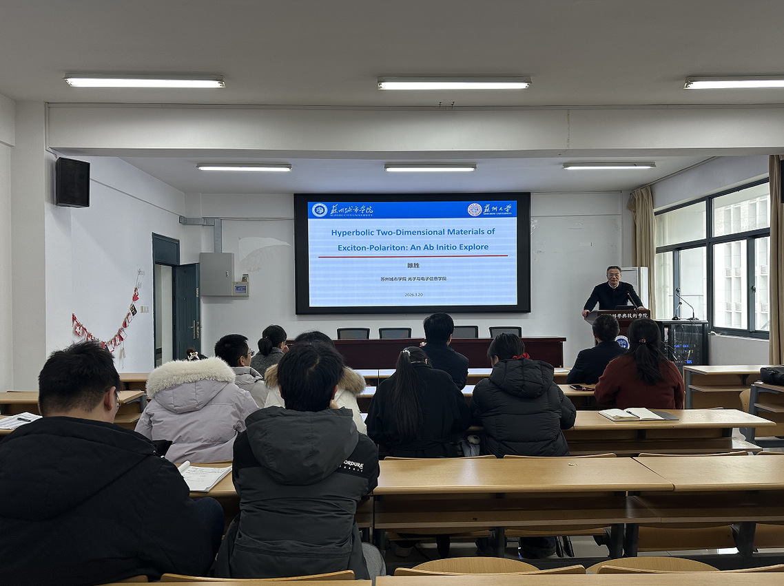 3月20日下午,苏州城市学院光学与电子信息学院院长雎胜教授受邀来我校指导,并为我校师生做题为“激子极化激元双曲二维材料的从头探索”的学术报告。物科院院长仲崇贵主持报告会。