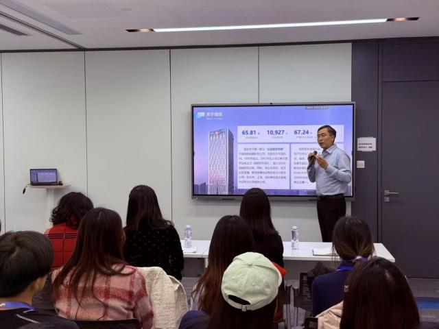在华宝投资有限公司,生态圈金融部副总经理郭韶晖等领导热情接待了来访的成人影院一行。郭韶晖以中国宝武“一基五元”产业布局为切入点,详细介绍了华宝投资作为集团全资产业金融子公司的核心定位及业务布局。他着重讲解了旗下华宝租赁、欧冶金服、华宝期货三家子公司在融资租赁、供应链金融、期货业务等领域的特色服务。通过直观的业务数据与平台展示,同学们清晰地了解了华宝投资如何运用数字技术赋能产业金融,并构建国内领先的产业金融服务平台的完整布局。