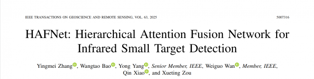 成果一:分层注意力融合机制。2025年发表于《IEEE Transactions on Geoscience and Remote Sensing》的研究论文《HAFNet: Hierarchical Attention Fusion Network for Infrared Small Target Detection》提出了一种分层注意力融合网络,针对传统 U-Net 在复杂背景下的小目标检测不足进行改进。HAFNet在保留 U-Net 高效结构的基础上,引入双分支语义感知模块,通过标准卷积与空洞卷积的双通路交互增强上下文建模。网络同时设计分层特征融合编码器与解码器,以分层注意力引导和跳跃连接注入机制实现多尺度特征高效融合。实验结果显示,HAFNet在NUAA-SIRST、IRSTD-1K、NUDT-SIRST三个数据集上均取得领先性能,在精度、鲁棒性和泛化能力上全面优于现有方法,为复杂场景下的红外小目标检测提供了有效方案。